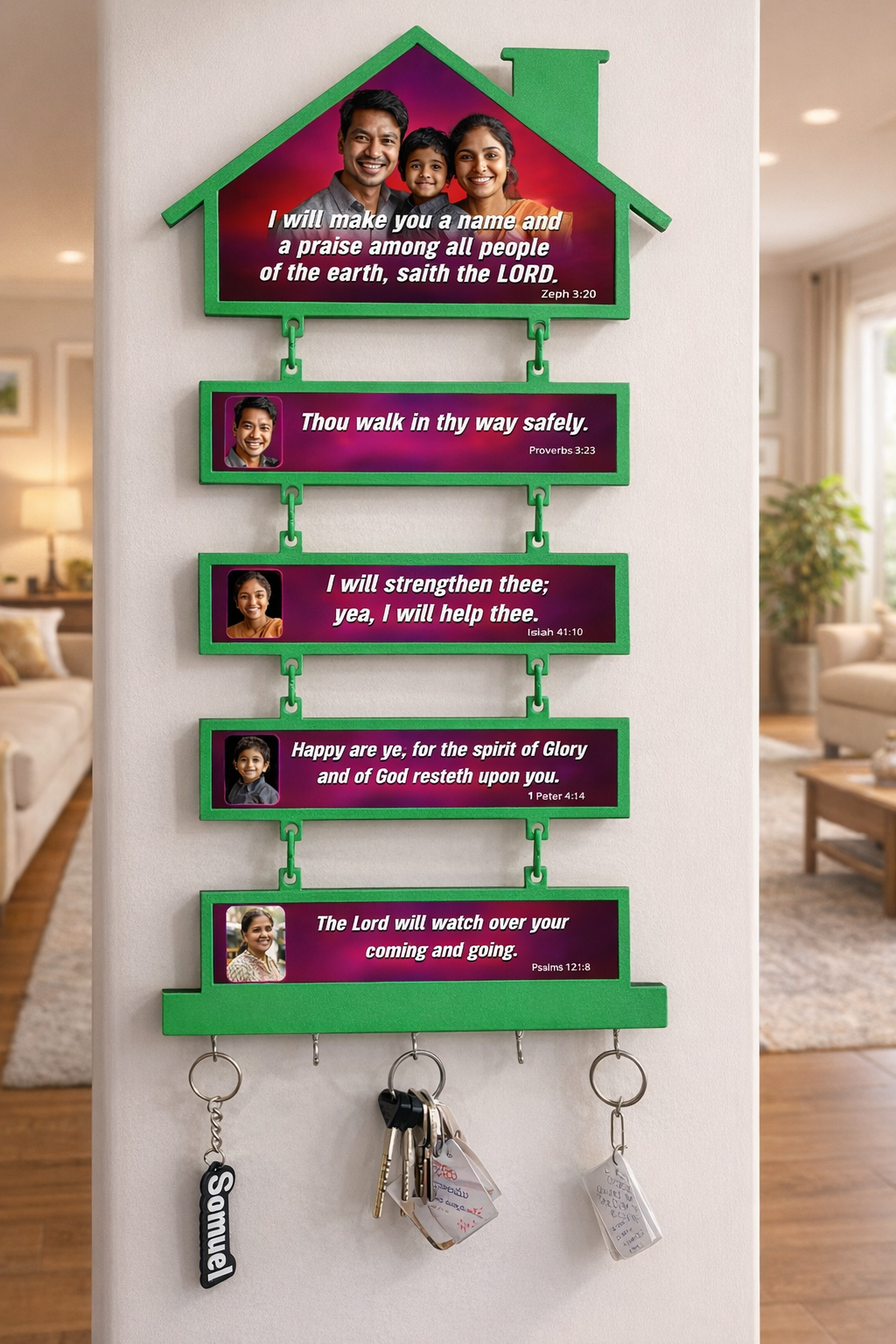 Family Promises Frame is a beautifully crafted scripture wall décor that celebrates faith, love, and togetherness. Designed with elegant photo placement and a built-in key holder, it keeps your home organized while surrounding your family with God’s promises every day. A meaningful addition to your entryway and a heartfelt gift for loved ones.